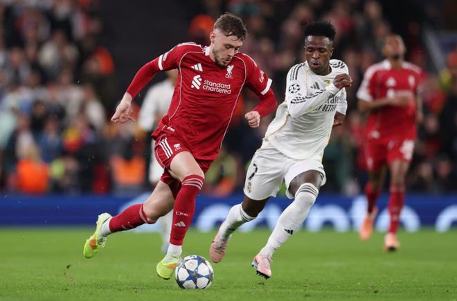 这场价值25.5亿欧的豪门较量,双方门将成为了上半场的主角,都有完成关键扑救,尤其库尔图瓦的神勇发挥,力保皇马球门不失,尤其第27分钟,维尔茨横传门前,索博斯洛伊近距离打门被库尔图瓦挡出。当然,利物浦门将马马尔达什维利也有发挥,上半场结束之前挡出了贝林厄姆的近距离打门,比还是0-0平。