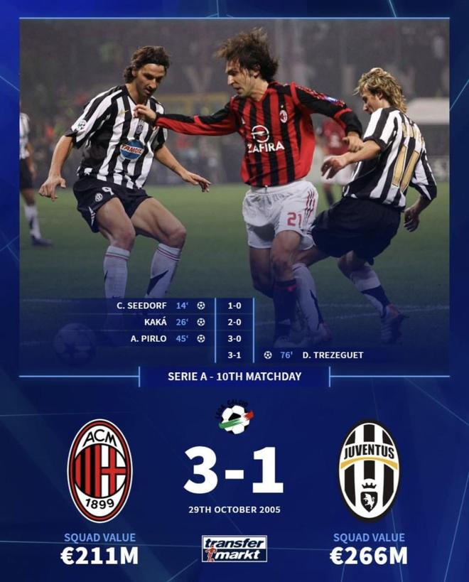 近日,知名足球数据网站德国转会市场的一组回顾数据引发讨论,复盘了2005年10月29意甲第10轮AC米兰对阵尤文图斯的经典较量。